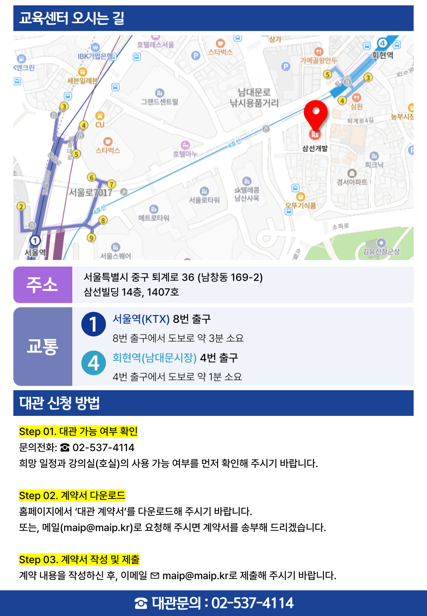 주소 : 서울시 중구 퇴계로 36 남창동 169-2 삼선개발 빌딩 14층, 1407호 TEl : 02-537-4114 FAX : 02-6910-0334 Email : maip@maip.kr 대표 : 류기연 사업자번호 : 214-88-49333 |